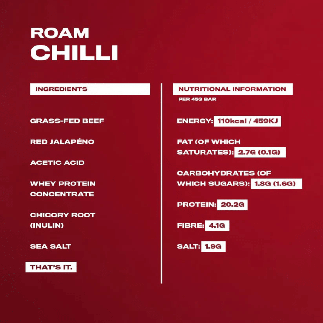 Grass-fed Beef, Red Jalapenos, Whey Protein Concentrate, Chicory Root Fibre, Sea Salt.